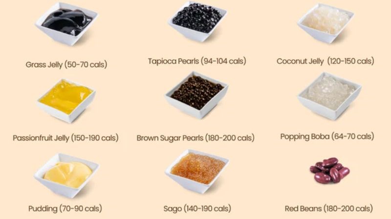 Chẳng hạn, trân châu (khoảng 50–70g) có thể cung cấp từ 150 đến 200 calo, trong khi các loại thạch như thạch củ năng hay thạch trái cây cũng mang lại từ 40 đến 180 calo. Nếu bạn chọn kết hợp nhiều loại topping như kem cheese hay pudding, tổng lượng calo có thể tăng lên rất nhanh, khiến ly trà sữa của bạn trở thành một bữa ăn nhẹ không hề nhỏ chút nào!