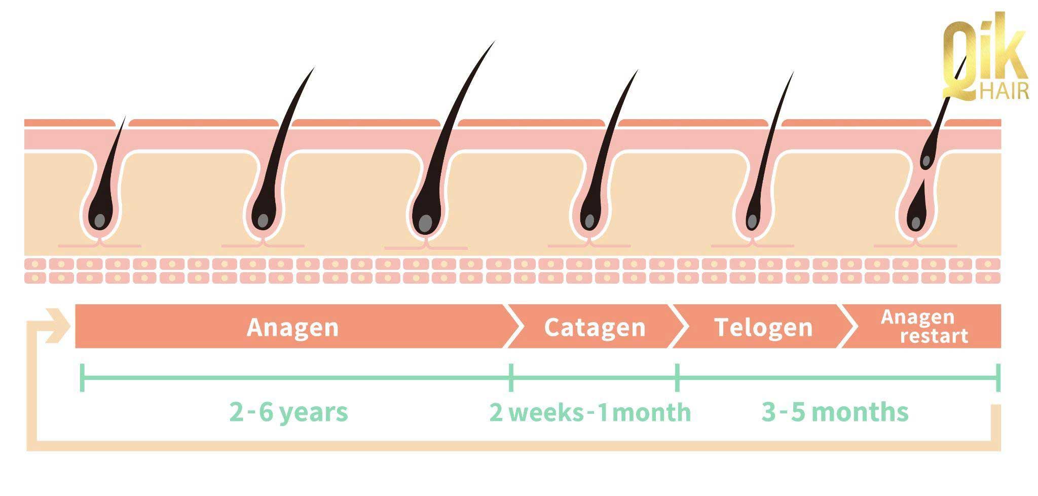 Quá trình mọc tóc diễn ra trong giai đoạn Anagen, kéo dài từ 6 đến 8 năm, trong đó tóc tăng trưởng tích cực và dài ra khoảng 1cm mỗi tháng. Đồng thời, mỗi ngày cũng có khoảng 50 đến 100 sợi tóc rụng đi, đây là hiện tượng sinh lý bình thường giúp duy trì sự cân bằng trên da đầu. Nếu tóc rụng nhiều hơn mức này, có thể là dấu hiệu của rối loạn hoặc bệnh lý cần được quan tâm.