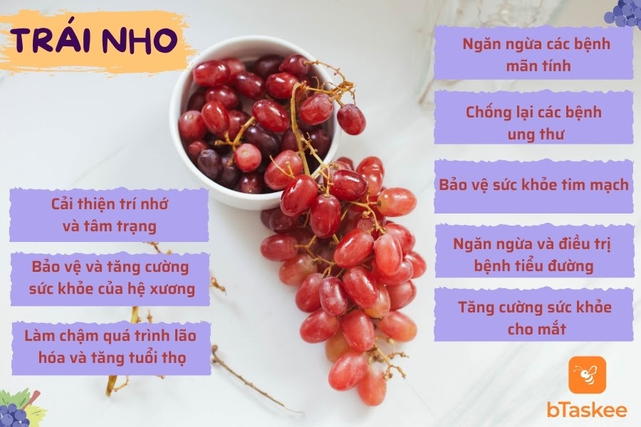 Không chỉ dừng lại ở đó, nho còn chứa nhiều vitamin và khoáng chất thiết yếu như vitamin C, vitamin K, canxi và magie, góp phần giữ cho xương luôn khỏe mạnh. Hơn nữa, nho cũng có tác dụng trong việc cải thiện tiêu hóa và giảm triệu chứng đau nửa đầu, mang lại cảm giác dễ chịu cho người sử dụng. Vì vậy, hãy bổ sung nho vào chế độ ăn hàng ngày để tận hưởng những lợi ích tuyệt vời mà chúng mang lại!