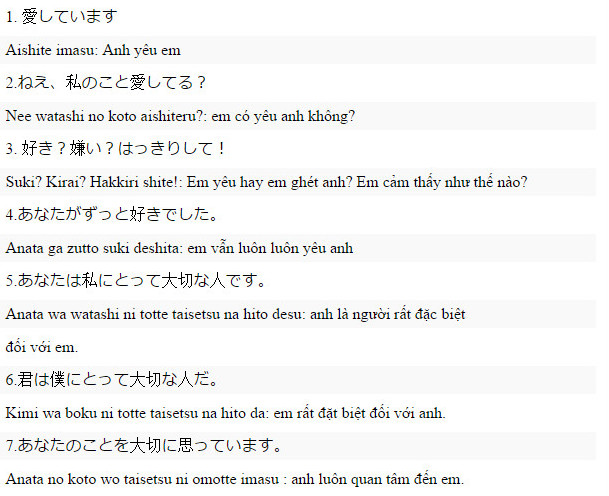 Khi bạn muốn thể hiện tình yêu với một người đàn ông, hãy nói “aishiteru yo”, còn với phụ nữ, bạn sử dụng “aishiteru wa”. Mặc dù “aishiteru” khá phổ biến, nhưng thực tế tình từ này rất ít được dùng trong giao tiếp hàng ngày. Thay vào đó, bạn có thể bắt đầu với “anata ga suki” hay “daisuki desu” để bày tỏ sự thích thú và sự quan tâm.
