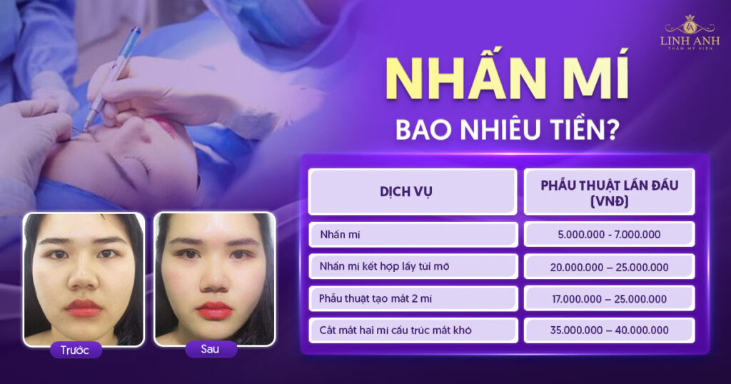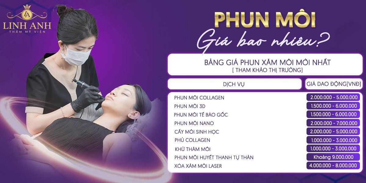 Thẩm mỹ viện Linh Anh có bảng giá dịch vụ rất đa dạng, phù hợp với nhiều nhu cầu làm đẹp khác nhau. Ví dụ, dịch vụ phun môi collagen dao động từ khoảng 3 triệu đến 8 triệu đồng, còn phun môi Diamond Lips có giá từ 5,6 triệu đến hơn 10 triệu đồng tùy theo kỹ thuật và mực xăm sử dụng. Ngoài ra, các dịch vụ trẻ hóa da như Renew Skin có giá khoảng 650 nghìn đồng, trong khi các liệu trình nâng cơ chống lão hóa có thể lên đến 60 triệu đồng tùy mức độ và công nghệ áp dụng.