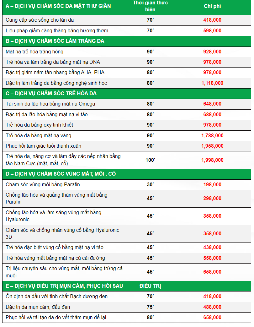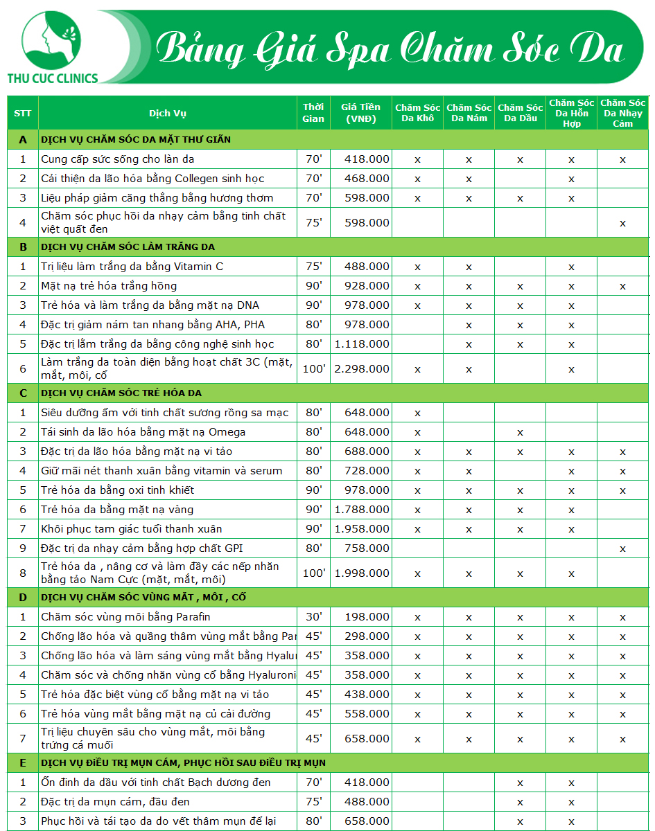 Bảng Giá Thẩm Mỹ Viện Thu Cúc