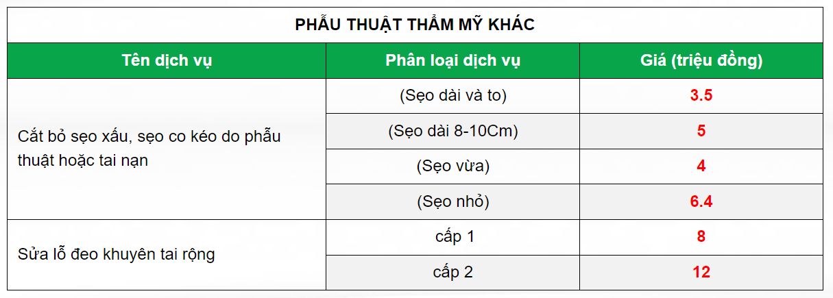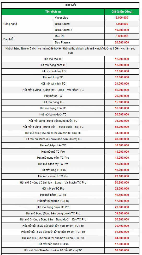 Lưu ý rằng giá cả có thể thay đổi tùy theo thời điểm và chương trình khuyến mãi hiện hành. Để biết thông tin chi tiết và cập nhật nhất, bạn nên liên hệ trực tiếp với Bệnh viện Thẩm mỹ Thu Cúc.