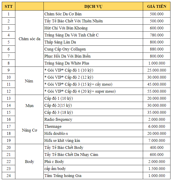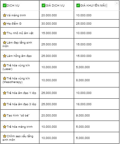 Bảng giá thẩm mỹ vùng kín hiện nay khá đa dạng, tùy theo dịch vụ và kỹ thuật mà mức chi phí có thể dao động từ khoảng 5 triệu đến 25 triệu đồng. Ví dụ, trẻ hóa vùng kín bằng công nghệ Laser có giá khoảng 7 triệu đồng, còn trẻ hóa bằng Mesotherapy khoảng 9 triệu đồng. Những dịch vụ phẫu thuật như vá màng trinh, thu hẹp âm đạo hay làm hồng âm đạo thường có giá từ 10 đến 20 triệu đồng, thậm chí có thể lên đến 25 triệu cho các kỹ thuật phức tạp hơn như thu hẹp âm đạo 3 lớp.