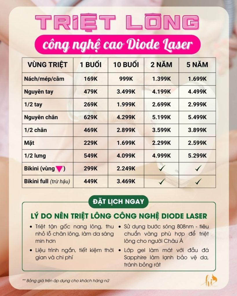 Nếu bạn đang tìm kiếm dịch vụ triệt lông cho vùng bikini hay mặt, mức giá sẽ nằm trong khoảng từ 1.500.000 đến 3.000.000 đồng. Không chỉ tiết kiệm thời gian, mà còn mang lại cảm giác thoải mái và an toàn khi diện đồ bơi hay trang phục khoe dáng.