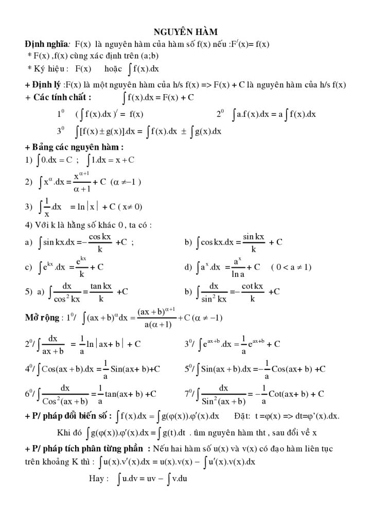 Hàm F(x) được gọi là nguyên hàm của f(x) trên một khoảng K nếu F'(x) = f(x) với mọi x thuộc K. Bảng nguyên hàm đầy đủ cung cấp những công thức cần thiết cho việc tính toán nguyên hàm của các hàm số số và hàm số hợp. Các bảng này không chỉ bao gồm các nguyên hàm cơ bản mà còn được mở rộng cho các trường hợp phức tạp hơn.