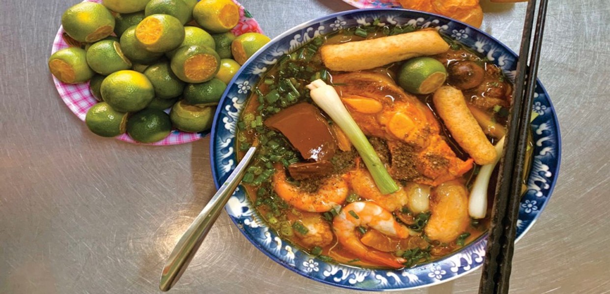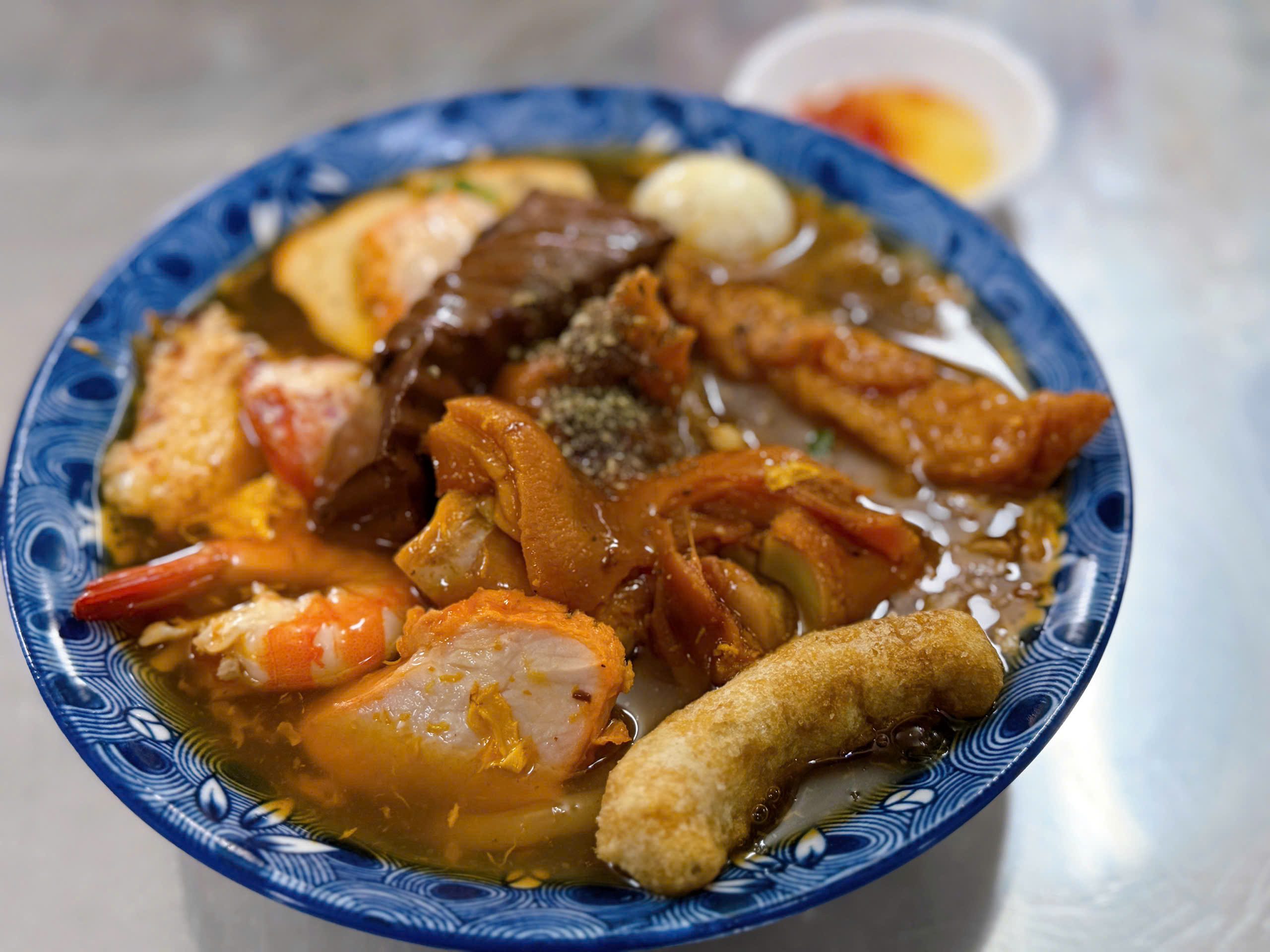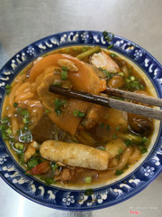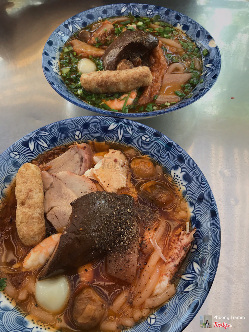 Topping của quán cực kỳ phong phú, gồm thịt nạc heo xắt lát, trứng cút, cua hấp dẫn, tôm tươi, chả cá và cả những lựa chọn giò heo gân, giò heo nạc, hay móng heo. Tất cả hòa quyện trong nước dùng có màu đỏ cam hấp dẫn từ cà chua và gạch cua, khiến bạn không thể cưỡng lại.