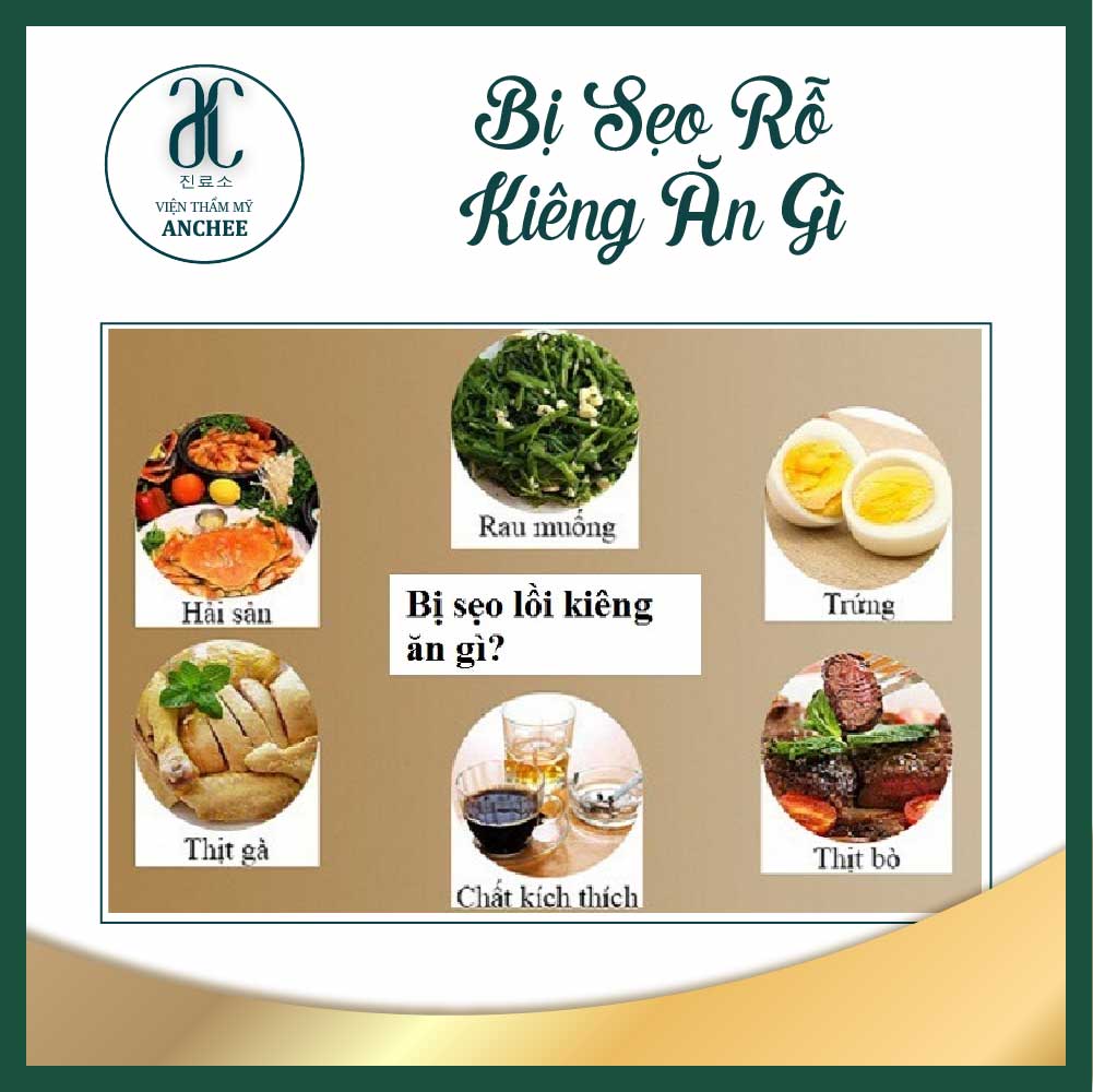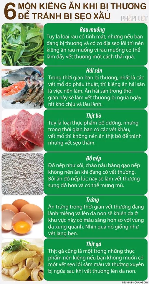 Khi bạn bị vết thương, việc kiêng cữ ăn uống là rất quan trọng để ngăn ngừa hình thành sẹo. Chế độ ăn uống hợp lý có thể giúp vết thương mau lành hơn. Một số thực phẩm cần tránh bao gồm thịt bò, thịt gà, hải sản, trứng và rau muống. Những món này được cho là có thể làm tăng nguy cơ sẹo lồi, đặc biệt là khi vết thương bắt đầu lên da non.