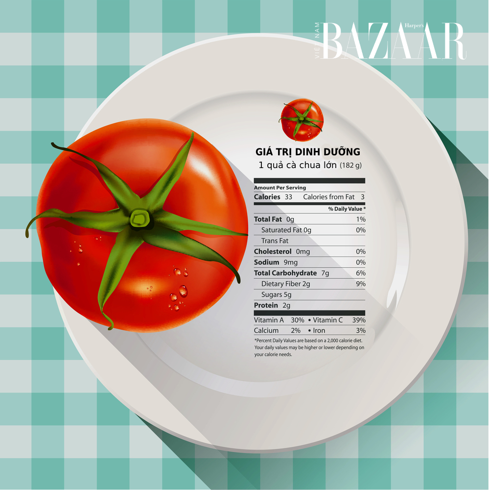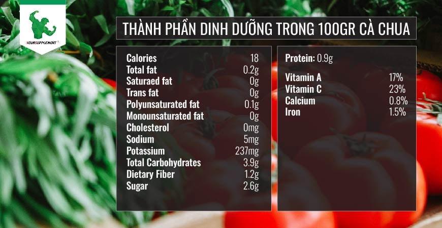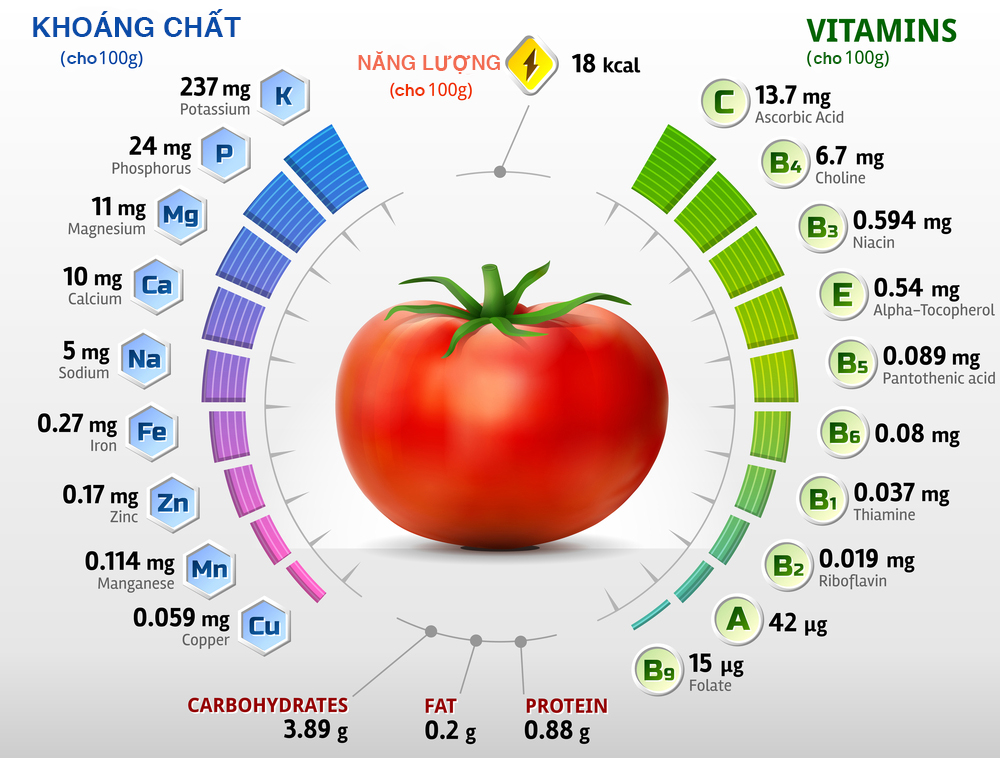 Trong 100g cà chua, bạn sẽ thấy khoảng 18 calo cùng với các chất dinh dưỡng khác, như 0,9g protein, 3,9g carbohydrate và 1,2g chất xơ. Đặc biệt, cà chua còn rất giàu vitamin A, C, và B6, giúp cải thiện sức khỏe làn da cũng như hệ miễn dịch.
