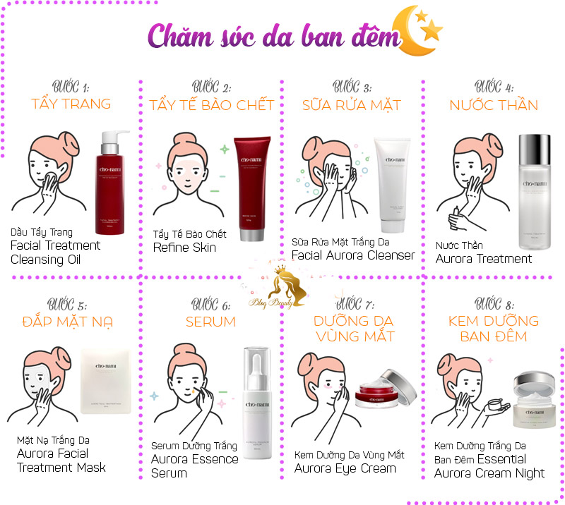 Chăm sóc da ban đêm là một phần quan trọng giúp bạn duy trì làn da khỏe mạnh và rạng rỡ. Đầu tiên, hãy bắt đầu bằng bước tẩy trang, loại bỏ lớp trang điểm và bụi bẩn tích tụ suốt cả ngày. Sau đó, dùng sữa rửa mặt sạch sâu để làm sạch da một lần nữa, để lỗ chân lông thông thoáng và sẵn sàng cho các bước tiếp theo.