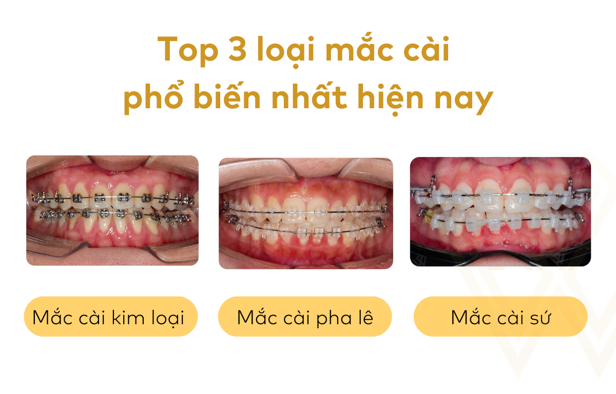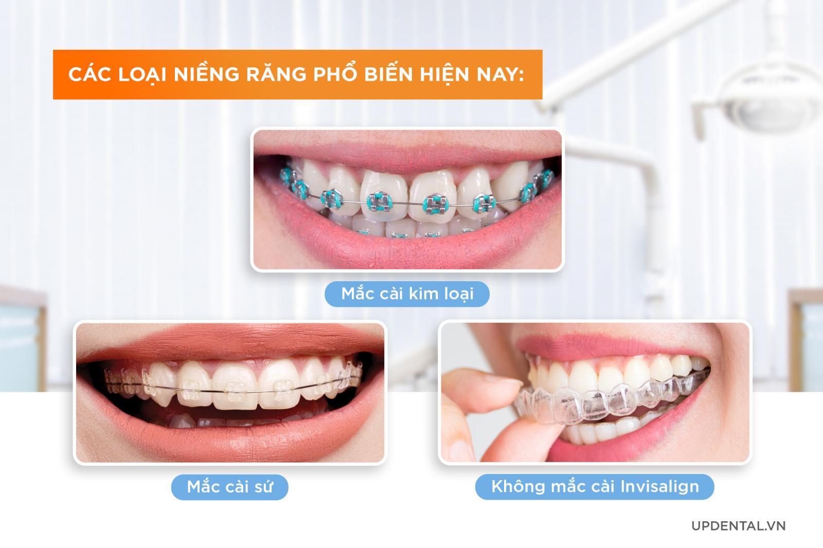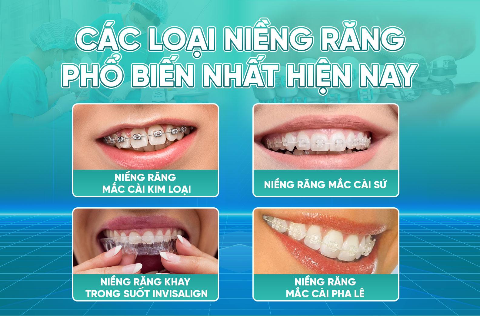 Hiện nay, có nhiều loại niềng răng phổ biến giúp bạn dễ dàng lựa chọn phù hợp với nhu cầu và điều kiện của mình. Loại truyền thống nhất là niềng răng mắc cài kim loại, sử dụng mắc cài và dây cung bằng kim loại chắc chắn, có hiệu quả cao nhưng nhìn rõ khi đeo.