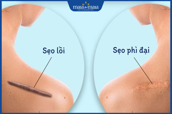 Sẹo lồi cần được phân biệt với sẹo phì đại, mặc dù cả hai đều là sẹo nổi gồ, nhưng sẹo lồi thường có kích thước lớn hơn và hình dạng bất thường hơn, đồng thời có độ dày và độ cứng cao hơn do sự tích tụ collagen dày đặc. Việc chăm sóc và điều trị sẹo lồi cần được thực hiện đúng cách để hạn chế sự phát triển và giảm thiểu khó chịu.