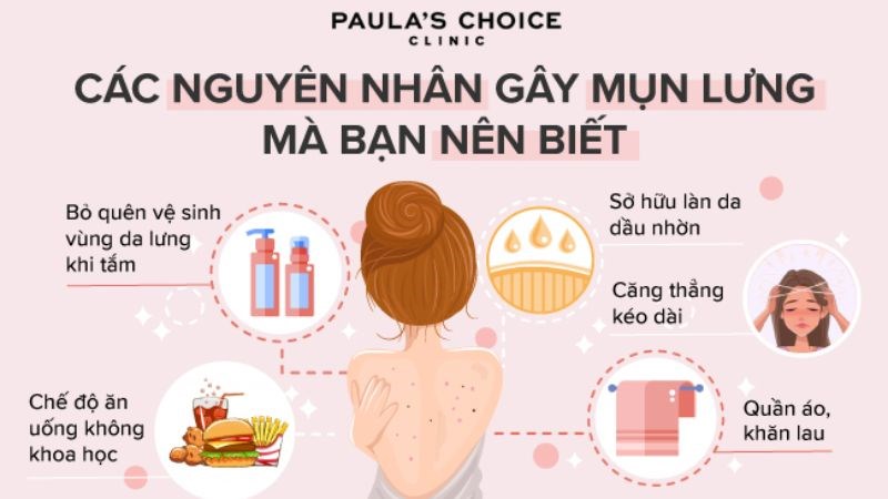 Mụn lưng là vấn đề khá phổ biến và có nhiều nguyên nhân gây ra. Một trong những nguyên nhân chính là sự tắc nghẽn lỗ chân lông, do tuyến bã nhờn hoạt động quá mức, khiến dầu nhờn tích tụ. Khi kết hợp với tế bào chết và vi khuẩn, điều này dễ dàng gây ra tình trạng mụn. Ngoài ra, việc không tắm sạch sau khi đổ mồ hôi cũng làm tăng nguy cơ nổi mụn.