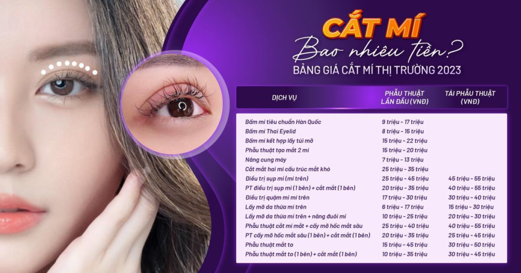 Cắt mí mắt hiện đang trở thành một trong những phương pháp làm đẹp được nhiều người lựa chọn để cải thiện diện mạo và sự tự tin. Tuy nhiên, bên cạnh yếu tố chất lượng thì chi phí cắt mí cũng là vấn đề được rất nhiều người quan tâm. Trên thị trường hiện nay, giá cắt mí mắt khá đa dạng, phụ thuộc vào nhiều yếu tố khác nhau như kỹ thuật thực hiện, tay nghề bác sĩ, uy tín của cơ sở thẩm mỹ… Trong bài viết dưới đây, chúng tôi sẽ giúp bạn tìm hiểu chi tiết về chi phí cắt mí mắt, các yếu tố ảnh hưởng cũng như lưu ý khi lựa chọn dịch vụ.