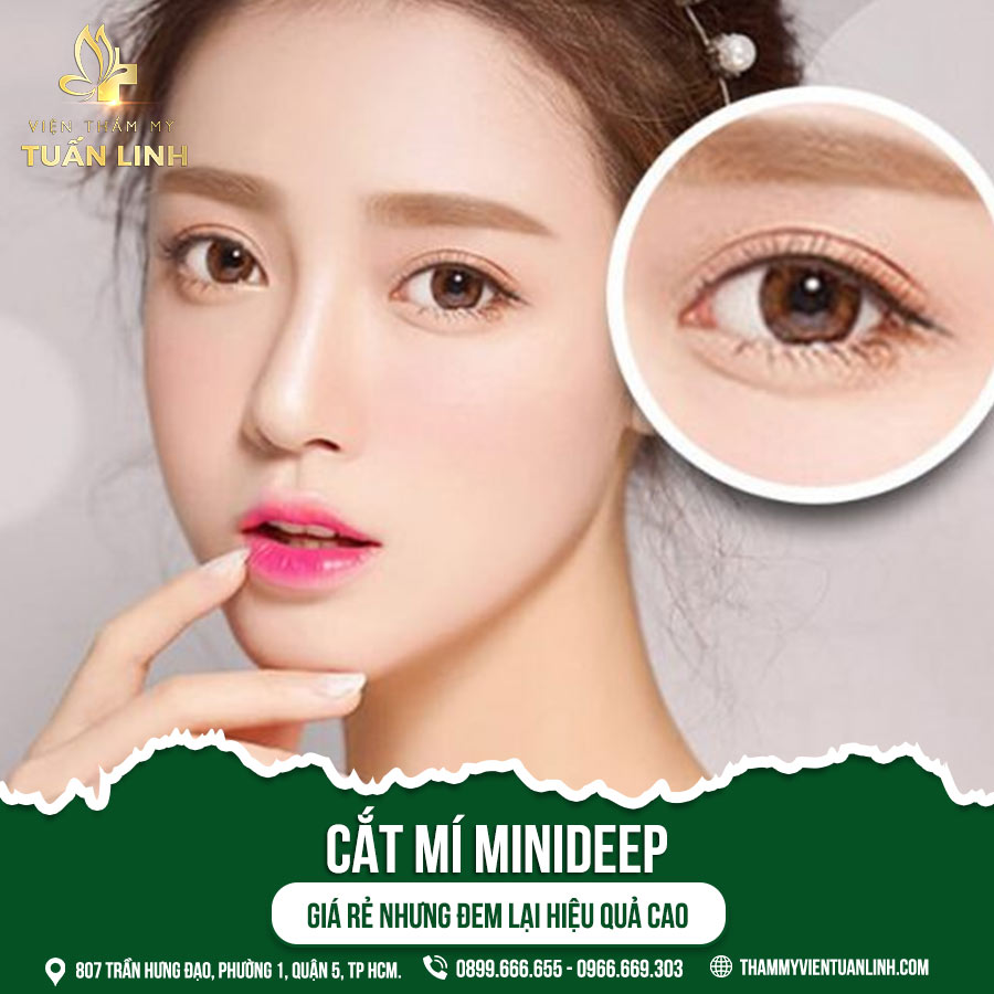 Phương pháp này được đánh giá cao vì thời gian thực hiện nhanh, hồi phục nhanh và nếp mí sau khi làm rất tự nhiên, trẻ trung. Đặc biệt, cắt mí Mini Deep còn giúp cải thiện tình trạng sụp mí, làm mắt to tròn và rạng rỡ hơn mà không để lại sẹo lớn hay dấu vết thẩm mỹ rõ ràng. Đây là lựa chọn lý tưởng cho những ai muốn có đôi mắt hai mí đẹp mà không cần can thiệp quá sâu hoặc phẫu thuật lớn.