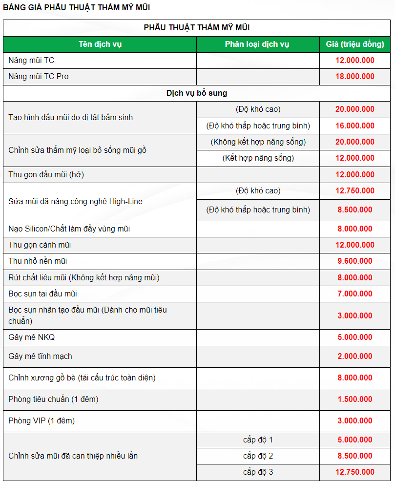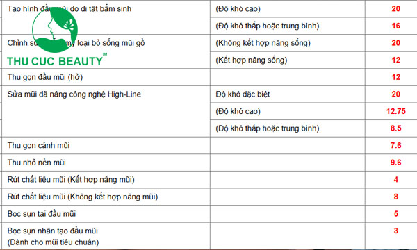 Đối với các phương pháp phẫu thuật nâng mũi, mức giá sẽ cao hơn, dao động từ 20 đến 50 triệu đồng. Ở Thu Cúc, bạn có thể tham khảo nhiều dịch vụ nâng mũi với bảng giá chi tiết. Chẳng hạn, việc thu gọn phần cánh mũi có giá khoảng 12 triệu đồng, trong khi nâng mũi trụ tiêu chuẩn chỉ khoảng 4 triệu đồng.