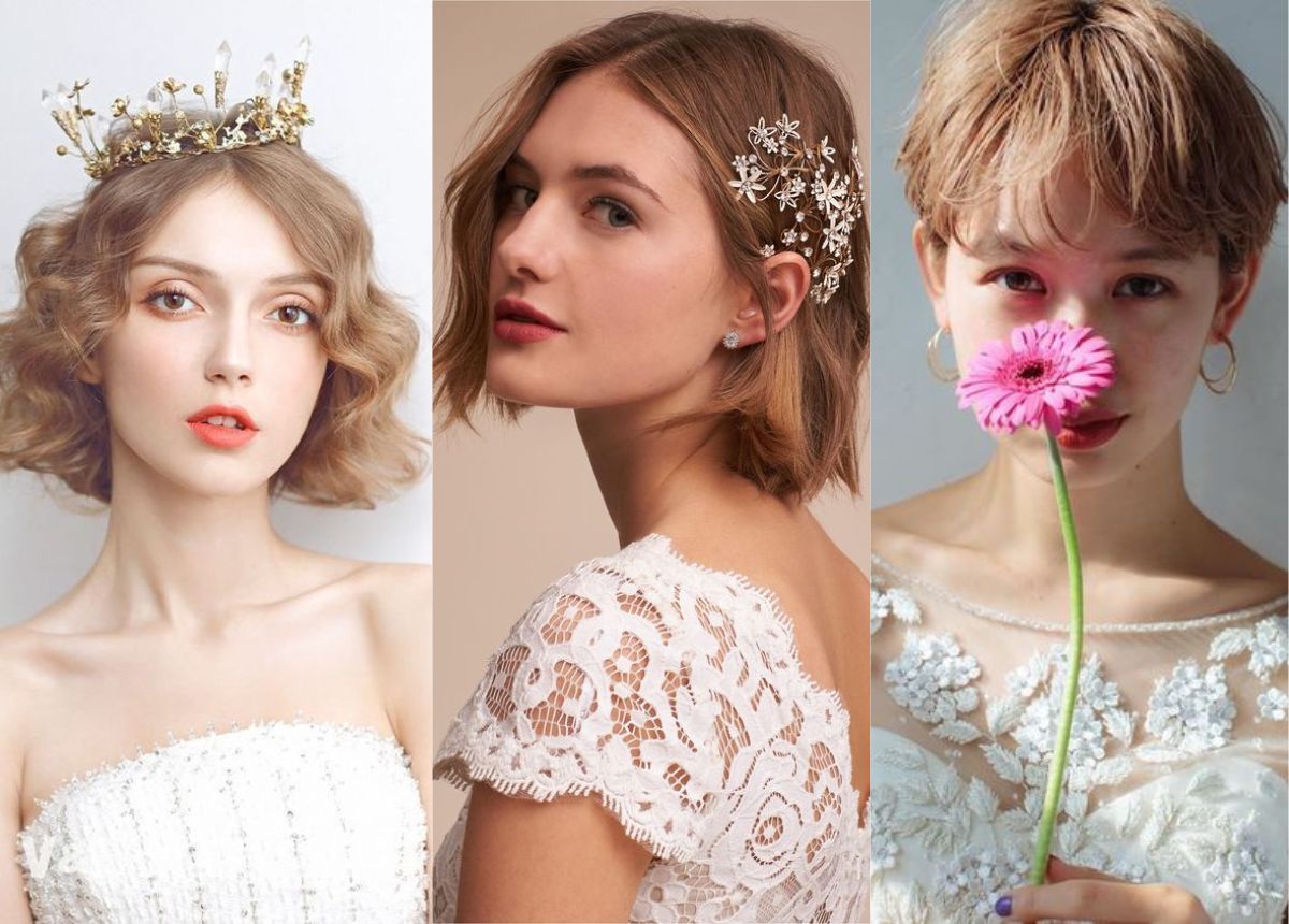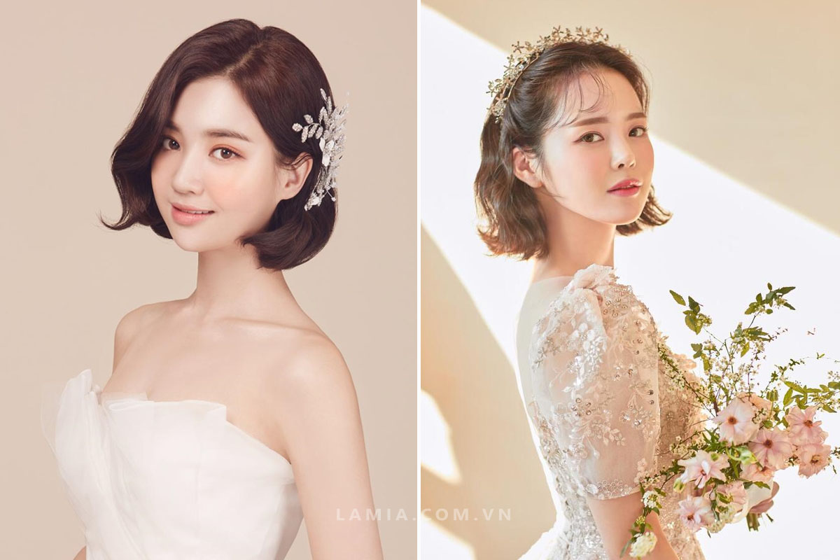 Ngoài kiểu tóc, phụ kiện cũng đóng vai trò quan trọng không kém. Với tóc ngắn, việc sử dụng băng đô đính đá, hoa tươi hay khăn voan sẽ tạo điểm nhấn xinh xắn và lãng mạn. Các phụ kiện đính đá như ngọc trai hay viên đá lấp lánh cũng sẽ giúp tăng thêm vẻ lôi cuốn cho cô dâu.