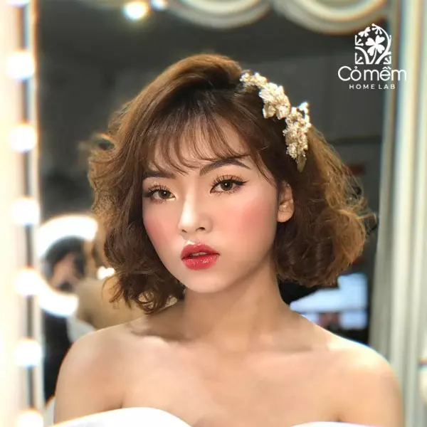 Ngoài tóc búi, các kiểu tóc xoăn nhẹ hoặc tóc bob uốn cụp cũng rất lý tưởng cho cô dâu mặt tròn. Những lọn tóc mềm mại sẽ tạo cảm giác thon gọn hơn cho khuôn mặt, mang lại vẻ đẹp trẻ trung và hiện đại. Bên cạnh đó, tóc lob – kiểu tóc ngắn với phần trước dài hơn cũng là một gợi ý hay, mang đến sự mới mẻ và năng động.