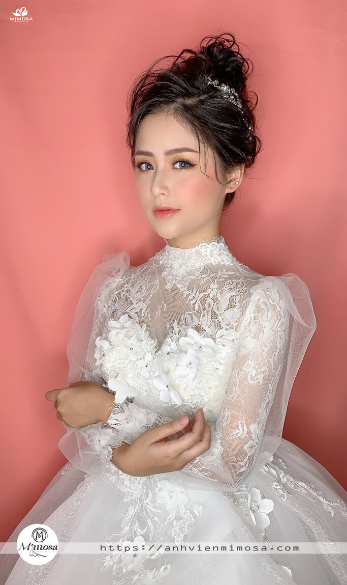 Ngoài ra, tóc búi thấp cũng là một lựa chọn lý tưởng. Kiểu tóc này mang lại sự nhẹ nhàng, thanh thoát, rất phù hợp với những cô dâu yêu thích sự đơn giản nhưng vẫn muốn nổi bật. Nếu bạn muốn tạo điểm nhấn cho gương mặt, hãy thử kiểu tóc xoăn nhẹ. Tóc xoăn buông lơi không chỉ giúp bạn sở hữu mái tóc dày dạn hơn mà còn làm mềm mại những đường nét trên khuôn mặt.