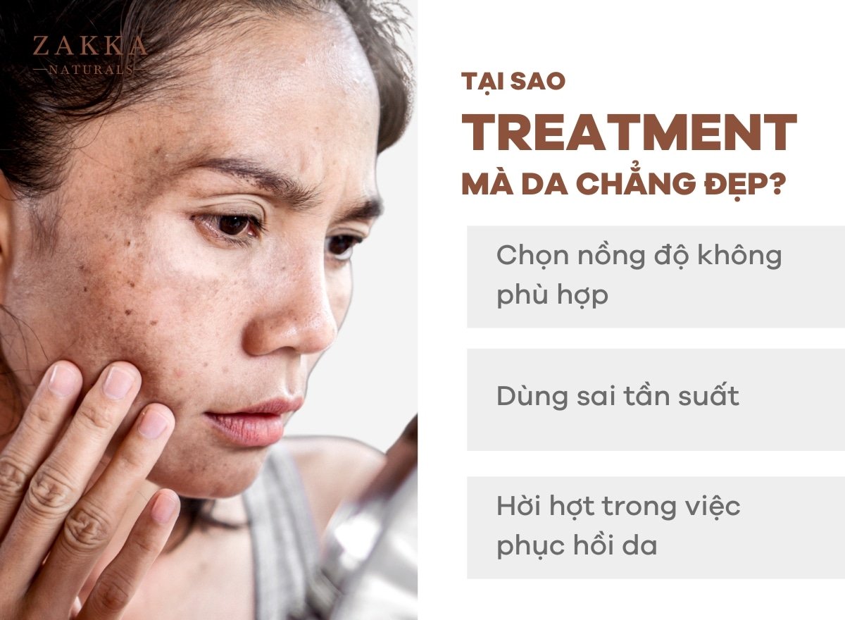 Làn da cần thời gian để thích ứng và phát huy hiệu quả của treatment, thường là từ 2 đến 4 tuần. Việc lựa chọn sản phẩm phù hợp với tình trạng da rất quan trọng để đạt được kết quả tốt nhất. Hãy kiên nhẫn và chăm sóc da một cách có khoa học, bạn sẽ thấy sự khác biệt!