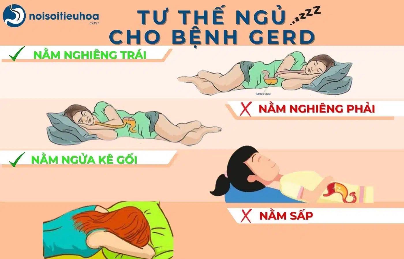 Khi nằm nghiêng, tư thế nằm bên trái được khuyến khích vì giúp dạ dày nằm thấp hơn thực quản, từ đó giảm nguy cơ trào ngược axit, hạn chế cảm giác ợ nóng và đau bao tử. Tư thế này còn giúp giãn cơ thắt thực quản dưới, hỗ trợ quá trình tiêu hóa diễn ra dễ dàng hơn nhờ trọng lực giúp thức ăn và dịch axit nằm ở một bên dạ dày thuận lợi cho tiêu hóa.