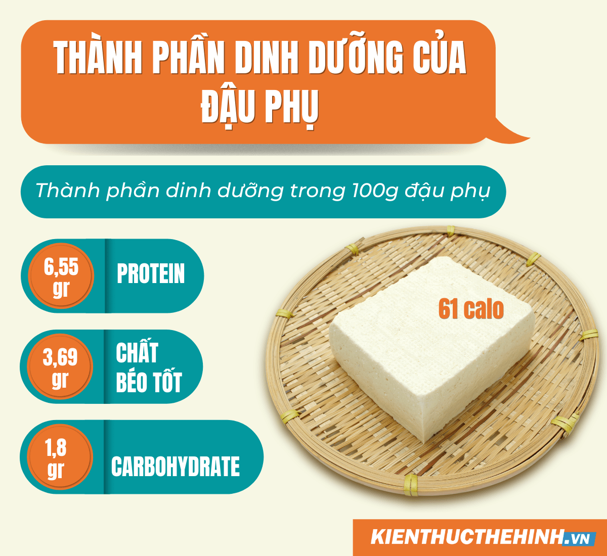 Đậu phụ là một nguyên liệu dinh dưỡng rất quen thuộc trong ẩm thực Việt Nam và được chế biến theo nhiều cách khác nhau. Trung bình, trong 100g đậu phụ tươi, bạn sẽ nhận được khoảng 70 calo, cùng với các thành phần dinh dưỡng như 8g protein, 4g chất béo và 2g carb. Điều này khiến đậu phụ trở thành một lựa chọn lý tưởng cho những ai đang theo chế độ ăn kiêng hoặc muốn kiểm soát cân nặng.