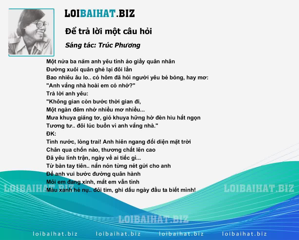 “Để Trả Lời Một Câu Hỏi” không chỉ là một ca khúc nhạc quê hương mà còn mang trong mình những cảm xúc sâu lắng, đầy tâm tư. Được sáng tác bởi nhạc sĩ Trúc Phương năm 1966, bài hát gợi nhớ về tình yêu thương trong những năm tháng kháng chiến. Qua giọng ca giàu cảm xúc, Thúy Huyền khéo léo truyền tải nỗi nhớ nhung của người lính với hình ảnh “áo giày quân nhân”, khiến người nghe không khỏi xúc động.