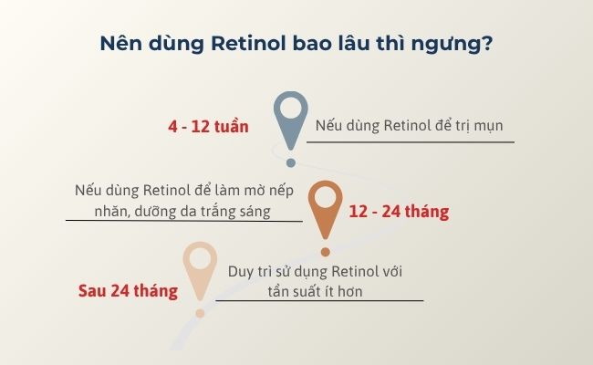 Việc sử dụng Retinol để chăm sóc da có hiệu quả nhưng cũng cần chú ý đến thời gian sử dụng. Nếu bạn đang dùng Retinol để trị mụn, khoảng thời gian lý tưởng để thấy sự cải thiện thường nằm trong khoảng 4 đến 12 tuần. Trong suốt quá trình này, bạn nên theo dõi tình trạng da để điều chỉnh nếu cần thiết.