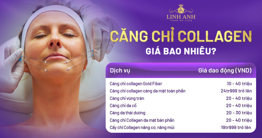 Đối với dịch vụ căng chỉ collagen, bảng giá sẽ có sự chênh lệch đáng kể. Căng chỉ toàn mặt có thể dao động từ 50 triệu đến 150 triệu đồng, tùy số lượng chỉ sử dụng. Các vùng da nhỏ như má hay rãnh cười thường có mức giá từ 15 triệu đến 25 triệu đồng, trong khi các vùng lớn hơn như cổ hay toàn mặt thì từ 60 triệu trở lên.