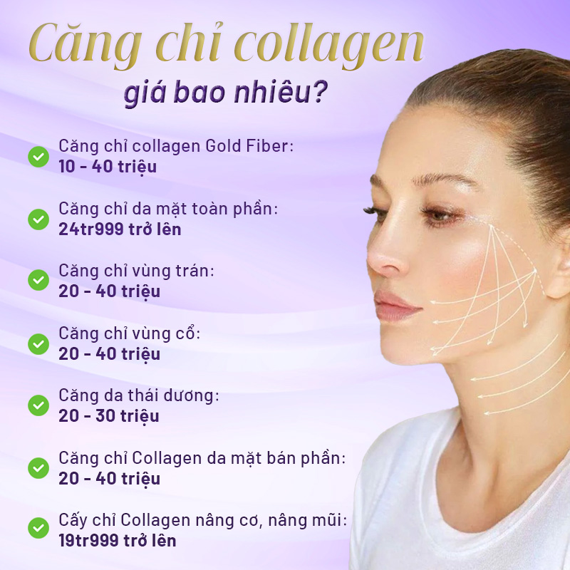 Cụ thể, bảng giá tham khảo năm 2025 cho thấy giá căng chỉ collagen toàn mặt có thể lên tới 150.000.000 đồng, trong khi các vùng nhỏ hơn như trán hay rãnh cười có giá từ 30.000.000 đến 50.000.000 đồng. Quy trình này sử dụng các sợi chỉ sinh học để kéo căng và trẻ hóa da một cách tức thì.