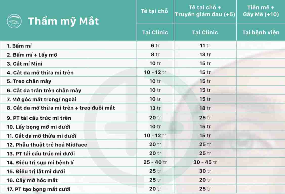 Đối với dịch vụ nhược cơ hoặc đính cơ, mức chi phí thường rơi vào khoảng 9.000.000 đến 17.000.000 VNĐ. Nếu bạn muốn tạo hình mắt hai mí hoặc nâng cung mày, giá sẽ giao động từ 7.500.000 đến 10.000.000 VNĐ. Đặc biệt, khi kết hợp lấy mỡ bọng mắt với cắt mí, bạn sẽ cần chi khoảng 18.000.000 đến 35.000.000 VNĐ, một khoản đầu tư nhưng có thể mang lại kết quả thẩm mỹ ấn tượng.