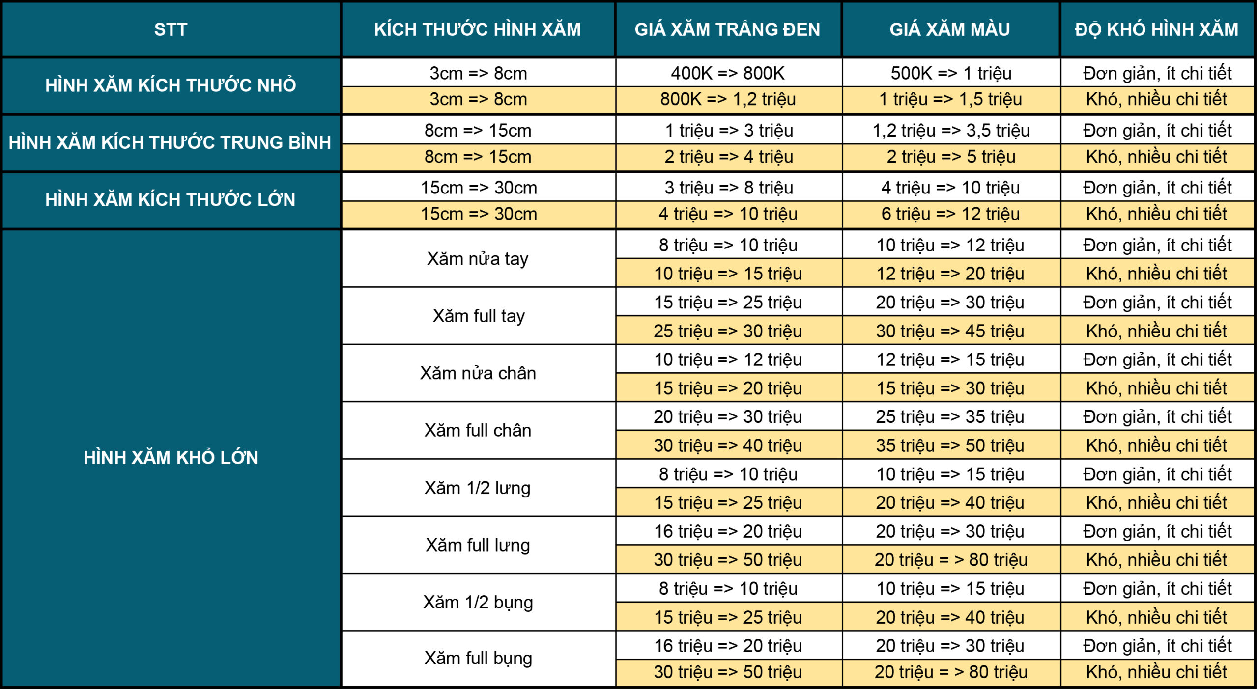 Một hình xăm lớn, như chân dung toàn bộ lưng hay tay, sẽ có giá khởi điểm từ 15 triệu VNĐ. Các hình xăm phức tạp hơn, thường đòi hỏi tay nghề của thợ xăm cũng như thời gian thiết kế và thực hiện nhiều hơn, thường sẽ có mức giá cao hơn. Chẳng hạn, một thiết kế riêng theo yêu cầu cũng có thể khiến bạn tiêu tốn từ 10 triệu VNĐ trở lên.