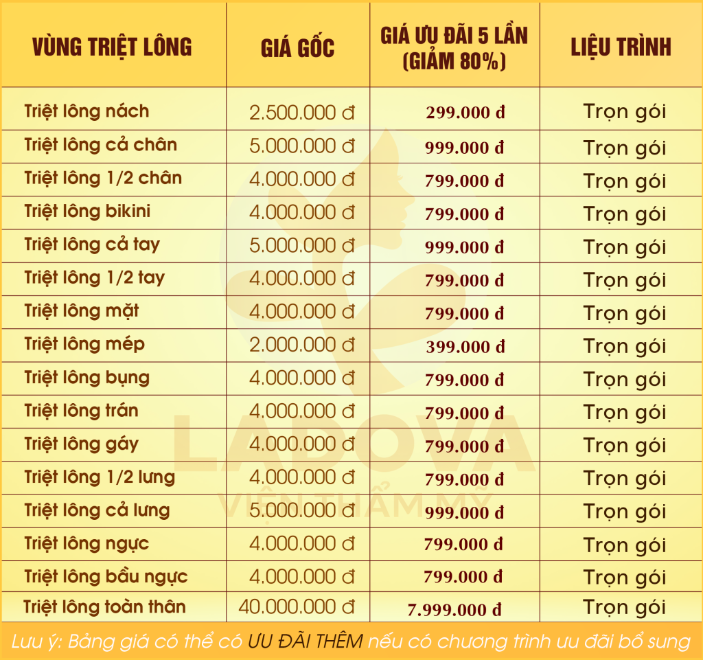 Ngoài ra, nhiều nơi còn có các combo triệt lông kết hợp nhiều vùng với giá ưu đãi, giúp tiết kiệm chi phí nếu bạn muốn triệt lông toàn thân hoặc nhiều vùng cùng lúc. Việc lựa chọn cơ sở uy tín và công nghệ tiên tiến là rất quan trọng để tránh tình trạng đau rát hay lông mọc lại sau điều trị.