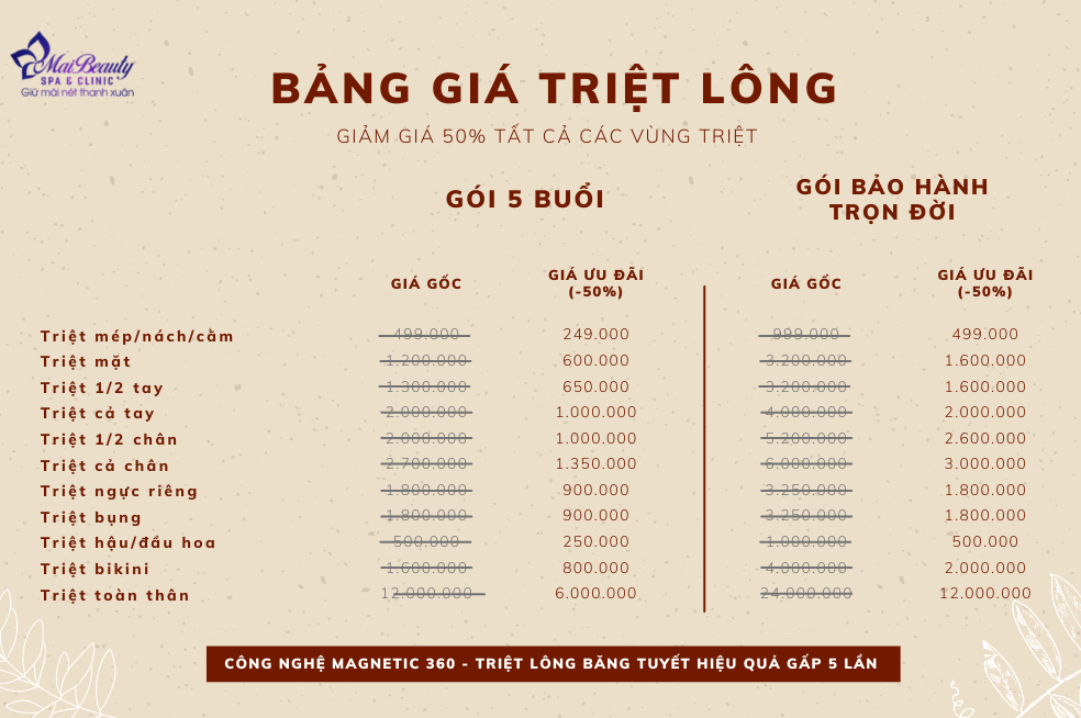 Mức giá này còn phụ thuộc vào diện tích vùng cần triệt, công nghệ laser hay ánh sáng sử dụng, cũng như uy tín của spa hoặc phòng khám. Các cơ sở có trang thiết bị hiện đại, bác sĩ chuyên môn cao thường có giá cao hơn nhưng đổi lại hiệu quả và an toàn cũng được đảm bảo hơn. Bạn nên đến trực tiếp để được tư vấn kỹ càng và chọn gói phù hợp với nhu cầu và tài chính của mình.