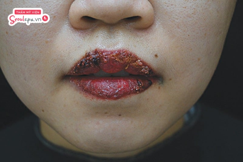 Tiếp theo, môi có thể chảy dịch bất thường, thường là dịch vàng hoặc xanh lá, có mùi hôi khó chịu và không ngừng sau 1-2 ngày. Đây là dấu hiệu rõ ràng cho thấy vi khuẩn đã xâm nhập và gây nhiễm trùng. Ngoài ra, môi còn có thể bị bầm tím, tụ máu hoặc lở loét, nổi mụn li ti khiến vùng môi trở nên rất khó chịu và mất thẩm mỹ.