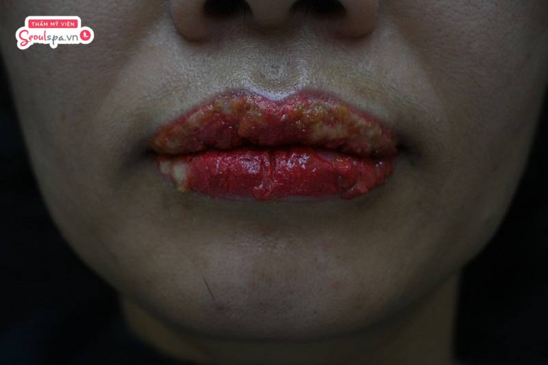 Phun môi bị nhiễm trùng mưng mủ là tình trạng khá nghiêm trọng mà nhiều người có thể gặp phải sau khi làm đẹp môi. Khi bị nhiễm trùng, môi thường sưng tấy, phồng rộp và có thể xuất hiện các mụn nước li ti chứa mủ, gây cảm giác đau rát, khó chịu mỗi khi cử động môi hoặc chạm vào. Ngoài ra, môi còn có thể bị tụ máu bầm, sưng to và có dịch chảy ra bất thường, thậm chí có mùi hôi khó chịu.