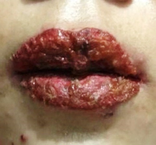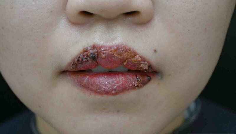 Hình ảnh xăm môi bị nhiễm trùng thường bắt đầu bằng những dấu hiệu như sưng tấy, đỏ, đau rát và nổi mụn nước li ti trên môi. Sau khi xăm, nếu môi không được chăm sóc đúng cách hoặc quy trình xăm không đảm bảo vệ sinh, vi khuẩn dễ dàng xâm nhập gây nhiễm trùng. Môi có thể bị khô, nứt nẻ, thậm chí đóng vảy và đau nhức khiến người bị khó khăn trong ăn uống và cử động môi.