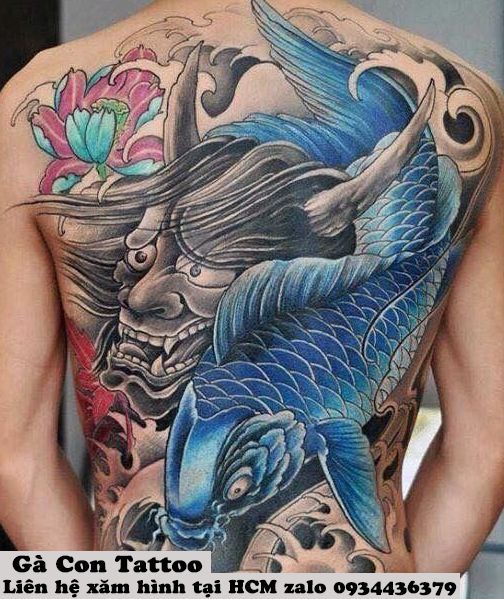 Hình xăm cá chép và mặt quỷ ở lưng, đặc biệt tại Gà Con Tattoo, đã thu hút không ít sự chú ý từ những tín đồ yêu thích nghệ thuật xăm hình. Với phong cách Irezumi truyền thống của Nhật Bản, hình xăm này không chỉ mang tính thẩm mỹ mà còn chứa đựng nhiều ý nghĩa sâu sắc. Cá chép biểu trưng cho sức mạnh, kiên nhẫn và sự may mắn khi vượt qua thử thách, trong khi mặt quỷ Oni lại thể hiện sự đối đầu với cái ác, nhắc nhở chúng ta về phần “người” bên trong.