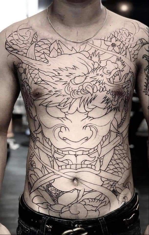 Hình xăm full bụng Nhật cổ trắng đen là một lựa chọn nghệ thuật độc đáo và ấn tượng dành cho những ai yêu thích phong cách xăm truyền thống Nhật Bản. Với diện tích rộng lớn của vùng bụng, hình xăm này cho phép nghệ nhân thỏa sức sáng tạo, kết hợp các họa tiết đặc trưng như rồng, cá chép, hoa mẫu đơn hay sóng nước một cách tinh tế và hài hòa. Màu đen trắng không chỉ làm nổi bật các chi tiết mà còn tạo nên vẻ đẹp cổ điển, mạnh mẽ nhưng vẫn rất tinh tế.