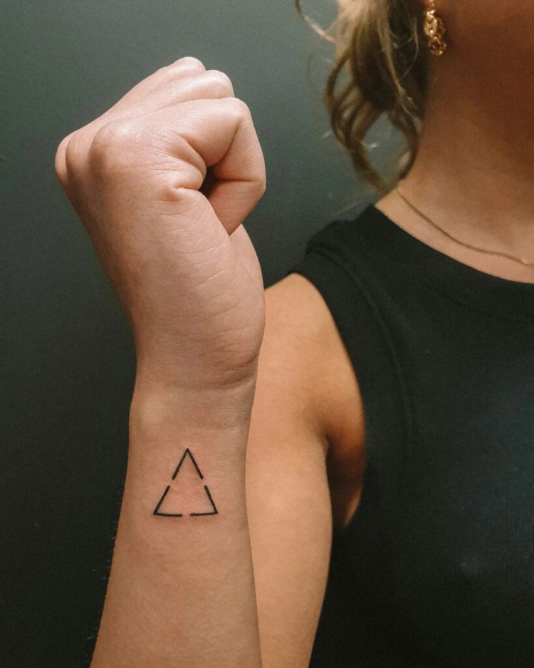 Với thiết kế tinh tế, hình xăm tam giác kép không chỉ mang ý nghĩa sâu sắc mà còn tạo nên vẻ đẹp huyền bí, sang trọng và cá tính cho người sở hữu, như một lời nhắc nhở về sự cân bằng và sức mạnh nội tại trong cuộc sống hàng ngày.