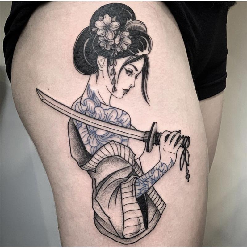 Khi nhìn vào hình xăm cô gái Nhật cầm ô hay mặt quỷ, người ta cảm nhận được nét đẹp độc đáo và sang trọng. Những hình ảnh này không chỉ thể hiện sự mềm mại mà còn ẩn chứa sức mạnh bên trong. Đặc biệt, khi hình xăm Geisha kết hợp với những yếu tố chiến binh, như cô gái cầm kiếm, nó tạo ra một biểu tượng kép đầy sức hút, vừa mạnh mẽ vừa uyển chuyển.