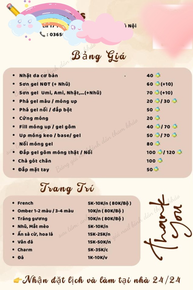 Ngoài ra, Hari Nail Studio cũng cung cấp một loạt các dịch vụ sơn móng, với giá từ 100.000 đến 150.000 vnđ cho sơn móng Gel, trong khi đắp móng Gel cao cấp có giá từ 200.000 đến 300.000 vnđ. Nếu bạn ưa thích sự sáng tạo, đắp và làm nail bột có mức giá linh hoạt từ 100.000 đến 300.000 vnđ.