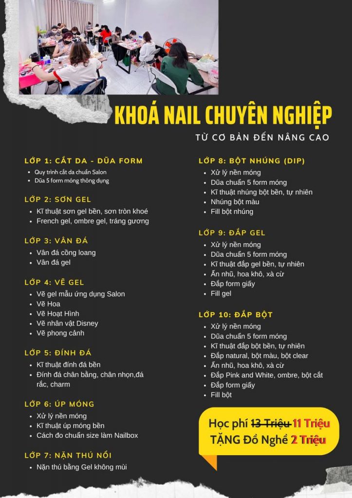 Hiện tại, các khoá học nail cơ bản thường có giá khoảng 10 – 15 triệu đồng, trong khi khoá nâng cao có thể dao động từ 13 – 17 triệu đồng. Những bạn yêu thích học nghề hơn nữa có thể chọn khoá chuyên sâu với chi phí khoảng 14.300.000đ. Ngoài ra, cũng có những khoá học online giá từ 15 triệu đến 20 triệu đồng rất thuận lợi cho những ai bận rộn.