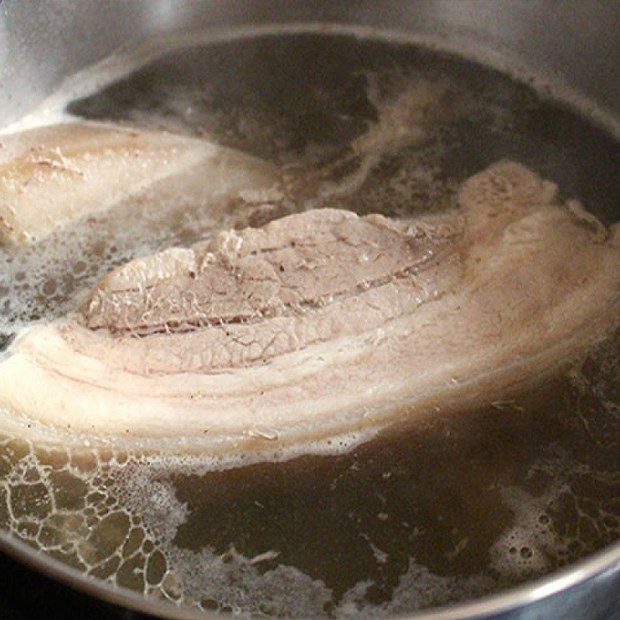Khi nước đã sôi, bạn cho thịt vào nồi. Một mẹo thú vị khác là bạn có thể trần thịt qua nước sôi với một thìa cà phê giấm và vài lát gừng thái mỏng để tăng thêm hương vị. Luộc thịt trong khoảng 10 phút, sau đó dùng đũa xiên thử; nếu đũa xuyên qua dễ dàng, chứng tỏ thịt đã chín.
