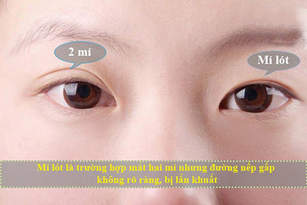 Mí lót, hay còn gọi là mí ẩn, là một hiện tượng rất đặc trưng trên đôi mắt. Đặc điểm dễ nhận biết nhất của mí lót là nếp mí mờ hoặc bị che khuất. Nhiều người có mắt 2 mí nhưng nếp mí thường không rõ ràng và chồng chéo nhau, tạo thành những nếp gấp không sắc nét. Điều này khiến cho mắt trông dường như nhỏ hơn và kém linh hoạt hơn so với thực tế.