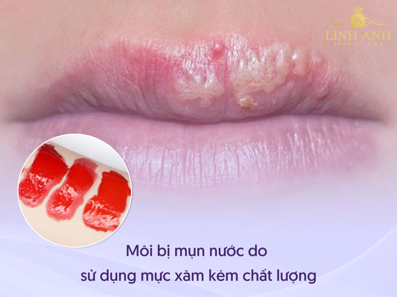 Ngoài virus Herpes, các nguyên nhân khác cũng có thể góp phần gây ra mụn nước. Kỹ thuật phun xăm lạc hậu, dụng cụ không được vệ sinh đúng cách và mực phun kém chất lượng đều có thể tạo điều kiện cho vi khuẩn xâm nhập vào xây dựng những tổn thương khó chịu. Đặc biệt, việc chăm sóc môi không đúng cách sau khi phun xăm sẽ làm tình hình trở nên tồi tệ hơn.