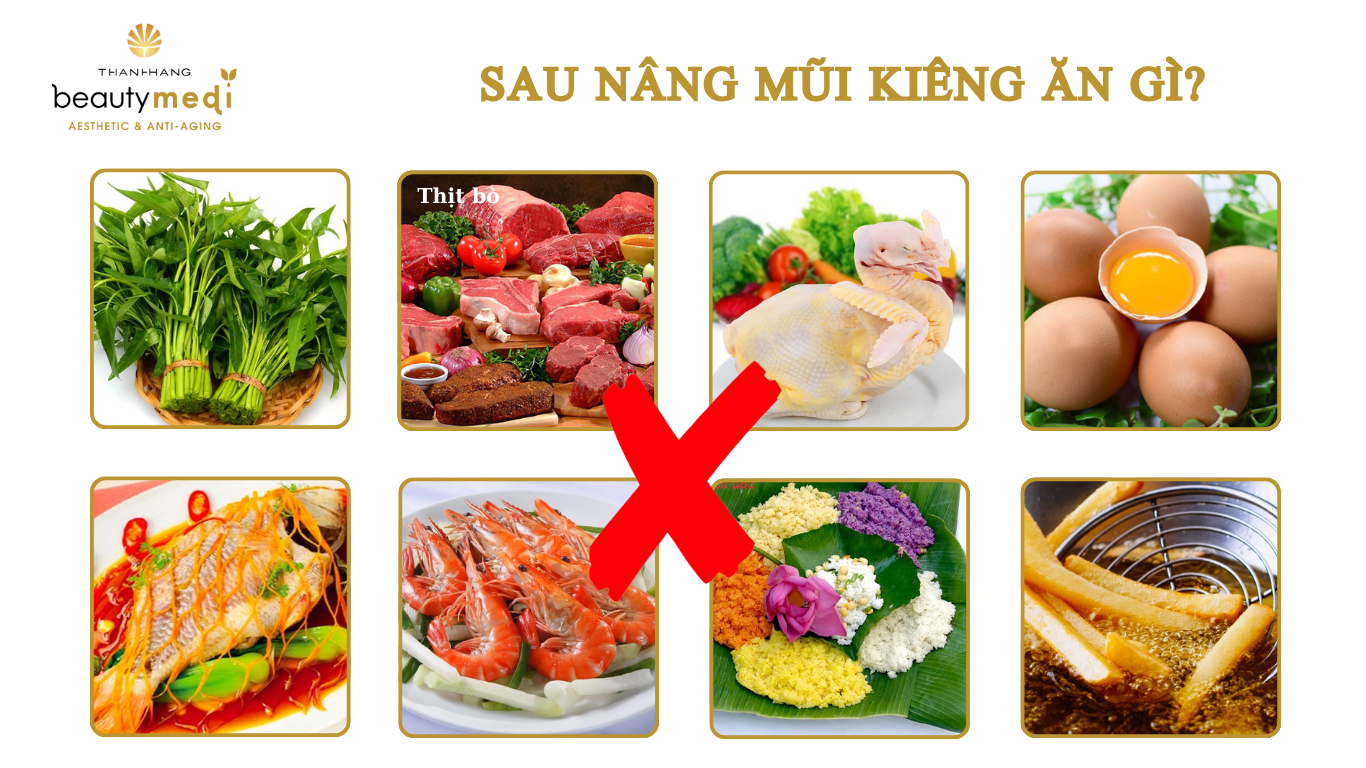 Bạn cũng nên tránh những thực phẩm dễ gây dị ứng hoặc làm vết thương lâu lành như hải sản, đồ nếp, thịt gà, đồ cay nóng, rượu bia và thuốc lá. Nếu có dấu hiệu bất thường, hãy liên hệ bác sĩ để được tư vấn kịp thời. Chế độ ăn uống khoa học không chỉ giúp bạn nhanh hồi phục mà còn giữ dáng mũi ổn định, đẹp như mong muốn.