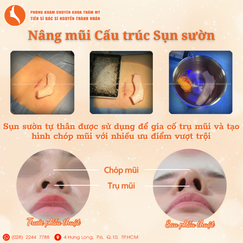 Quy trình nâng mũi sụn sườn thường kéo dài khoảng 2-3 tiếng, sau đó vết thương hồi phục nhanh với đường mổ nhỏ, hạn chế sẹo lộ rõ. Tuy nhiên, kỹ thuật lấy sụn sườn khá phức tạp và đòi hỏi bác sĩ có tay nghề cao để đảm bảo an toàn và hiệu quả thẩm mỹ. Đây là lựa chọn lý tưởng cho những ai muốn có dáng mũi cao, đẹp tự nhiên mà không lo kích ứng hay biến chứng lâu dài.