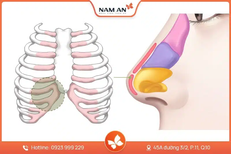 Nâng mũi sụn sườn là phương pháp thẩm mỹ sử dụng chính sụn lấy từ xương sườn của cơ thể để làm chất liệu nâng và chỉnh hình mũi. Sụn sườn thường được lấy từ vị trí xương sườn số 5 đến số 9, có đặc tính mềm mại, cong tự nhiên và rất tương thích với cơ thể, giúp giảm thiểu nguy cơ viêm nhiễm hay biến chứng sau phẫu thuật.