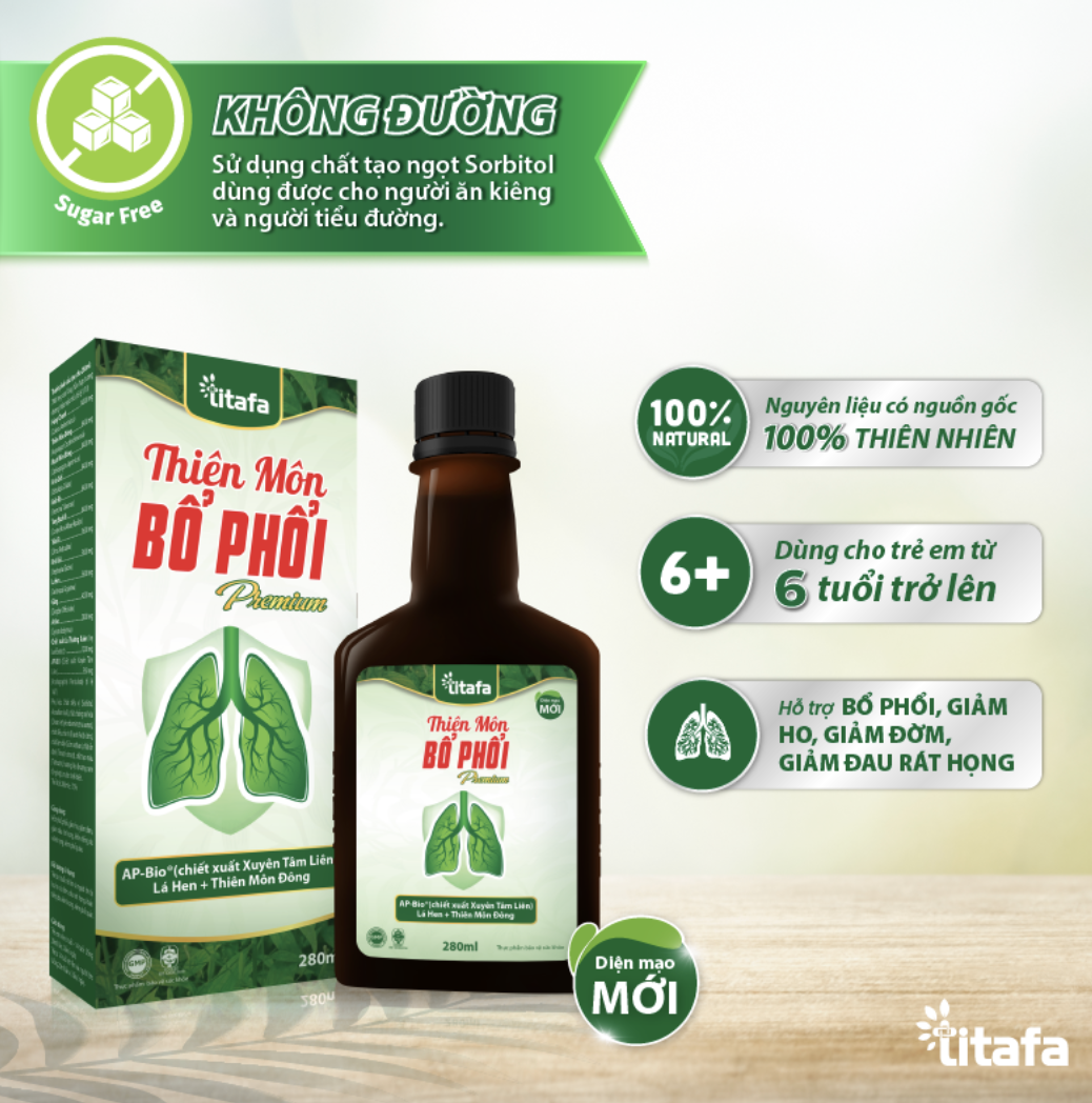 Theo thông tin từ nhà sản xuất Titafa, sản phẩm Thiên Môn Bổ Phổi Premium có sử dụng chất tạo ngọt thay thế thay vì đường thông thường, cụ thể trong thành phần phụ liệu ghi rõ:​